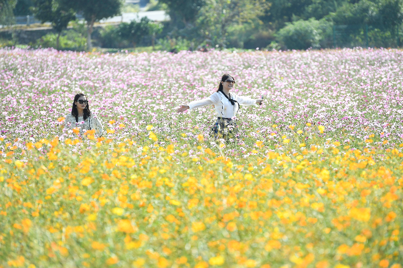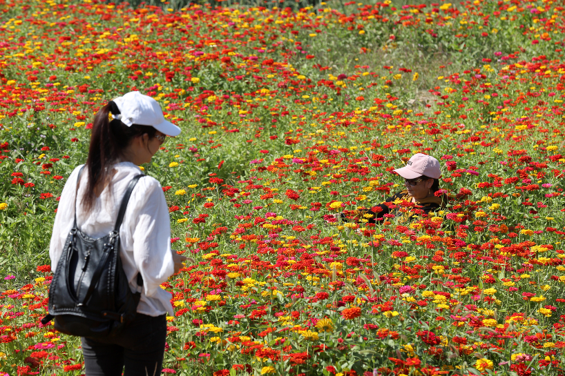 13日,游人行走在花海中。当日,湖南省株洲市石峰区清水塘街道大冲村“四季花海”景点的50亩鲜花绽放,吸引游人前往观赏。