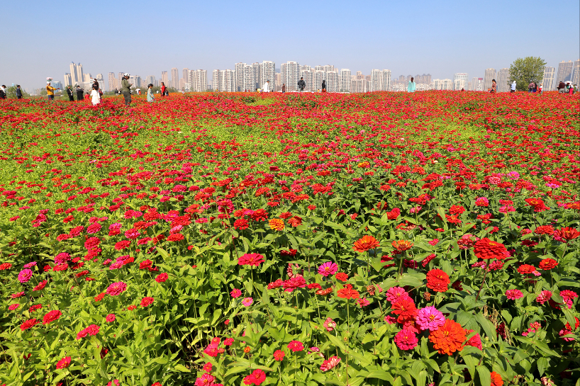19日,武汉汉江湾桥汉阳桥头下,大片百日草竞相开放,如同彩绘铺展在脚下,吸引众多市民前来打卡游玩。