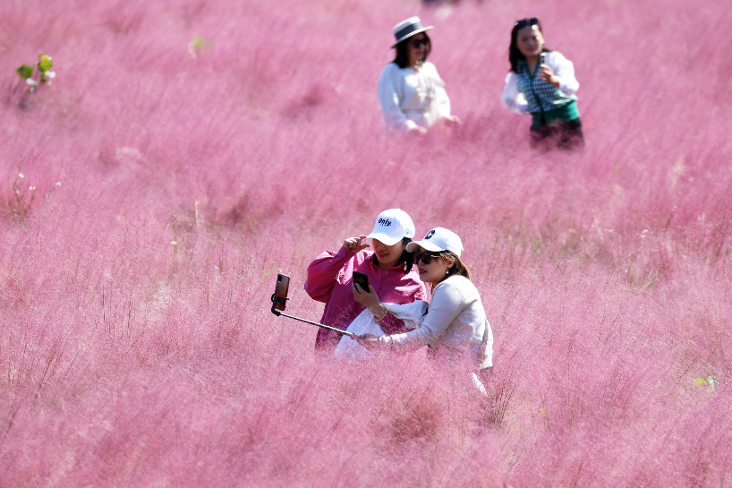 14日,市民在粉黛乱子草中拍照。近日,浙江杭州临平区大片的花海绽放,姹紫嫣红之景吸引市民。