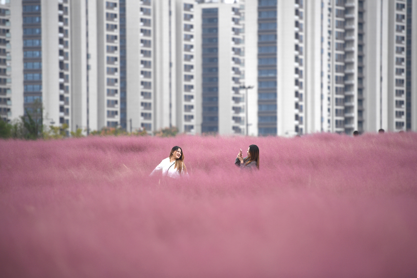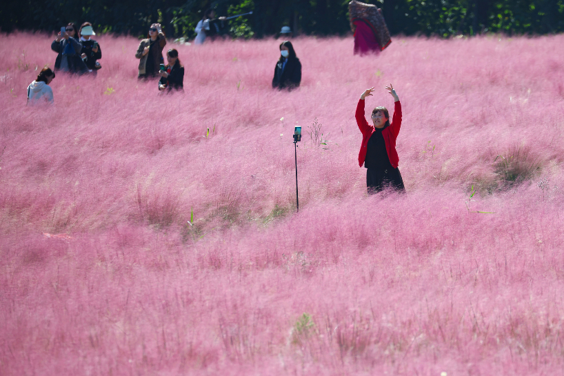 南京市民沐浴秋日阳光,徜徉“粉色花海”。