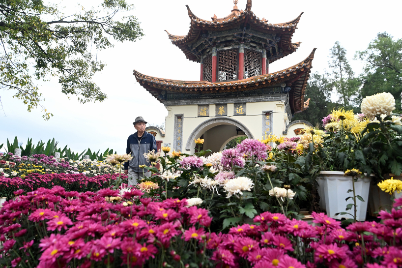 13日,云南昆明,盛放的菊花吸引游人。当日,第二十八届大观金秋菊花展正在昆明市大观公园展出,万余盆300多个品种的菊花吸引游人前往观赏。