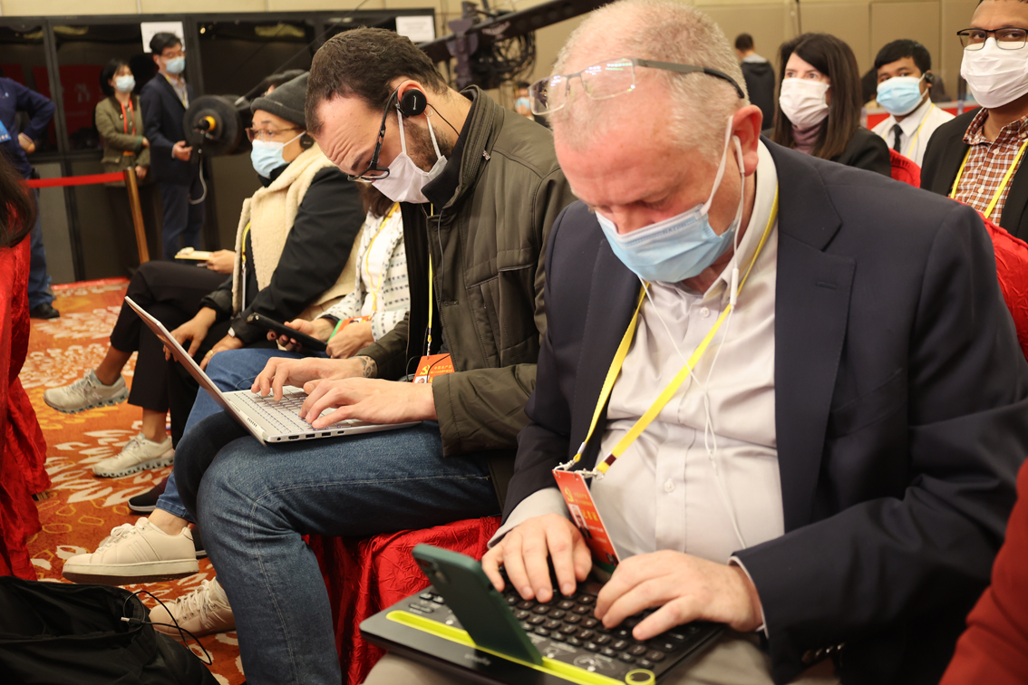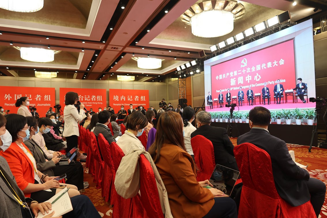 10月20日,二十大新闻中心举办第四场记者招待会。外国记者在新世纪日航饭店三层世纪厅分会场。