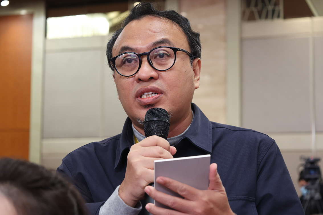 10月20日,二十大新闻中心举行第四场记者招待会。图为一名印尼记者在分会场提问。