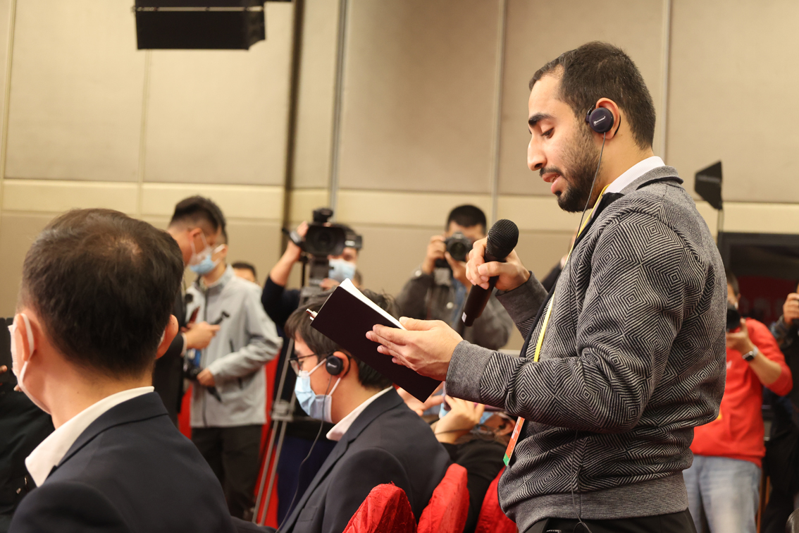 10月19日19时30分,二十大新闻中心举行第四场集体采访。图为阿曼《观点报》记者在新世纪日航饭店分会场提问。