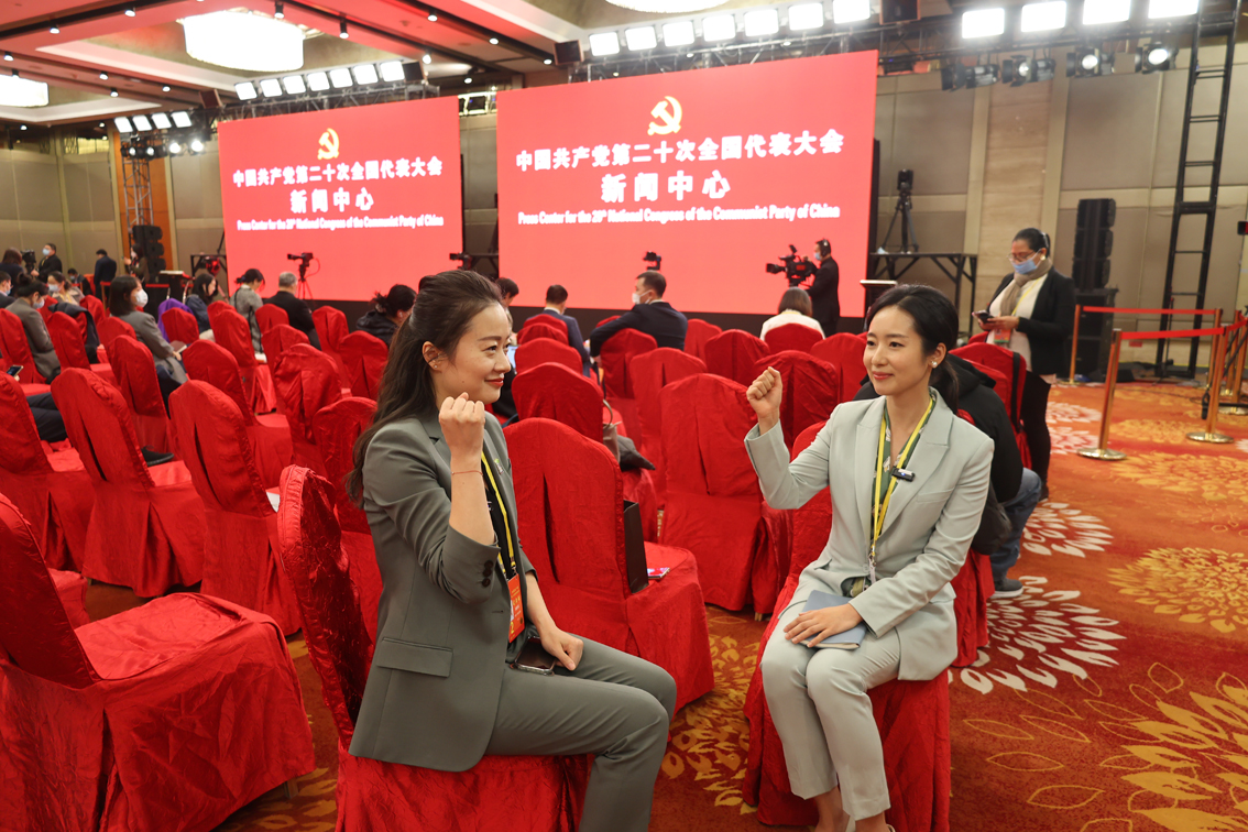 10月19日19时30分,二十大新闻中心举行第四场集体采访。图为两位中国女记者在新世纪日航饭店分会场对谈二十大感悟,相互鼓劲。