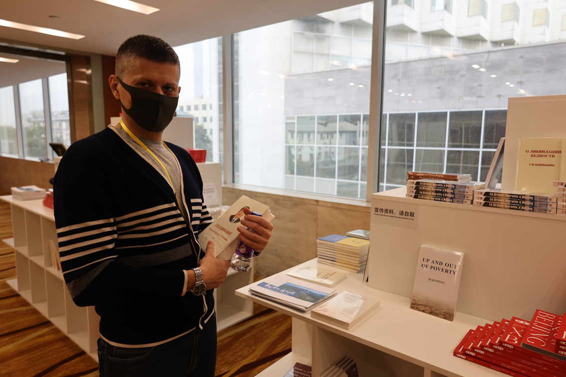 10月20日,在新世纪日航饭店,俄罗斯《议会报》驻京记者安东诺夫手里拿着一本俄语版《习近平谈治国理政》(第二卷)。
