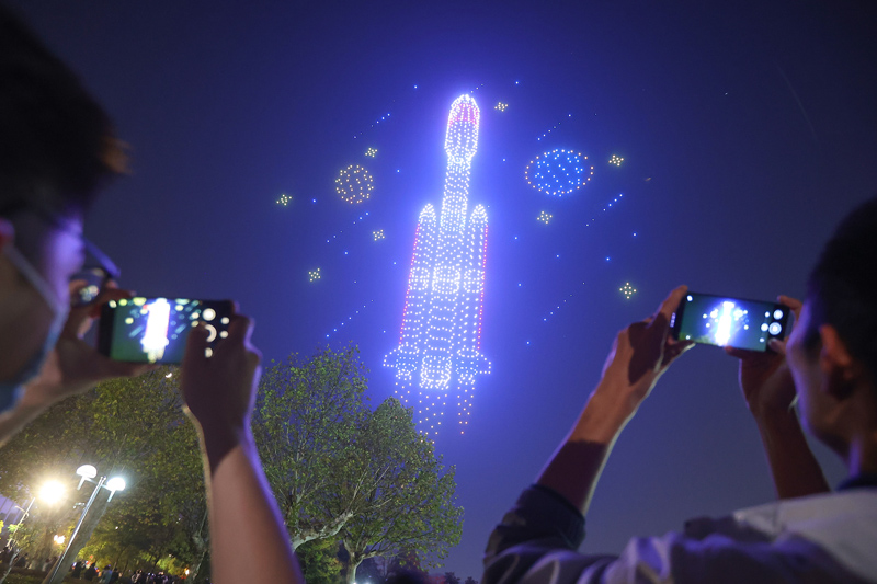 10月30日晚,南京航空航天大学上演无人机光影秀,2022架无人机组成航天器对接、火箭升空、C919大飞机飞行、宇航员出舱等图案,用专业特色庆祝该校建校70周年。图为无人机组成“火箭升空”图案。(图片来源:中新社)