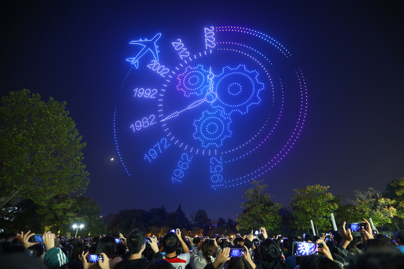 10月30日晚,南京航空航天大学上演无人机光影秀,2022架无人机组成航天器对接、火箭升空、C919大飞机飞行、宇航员出舱等图案,用专业特色庆祝该校建校70周年。图为无人机组成“1952-2022倒计时齿轮、分针旋转”图案。(图片来源:中新社)