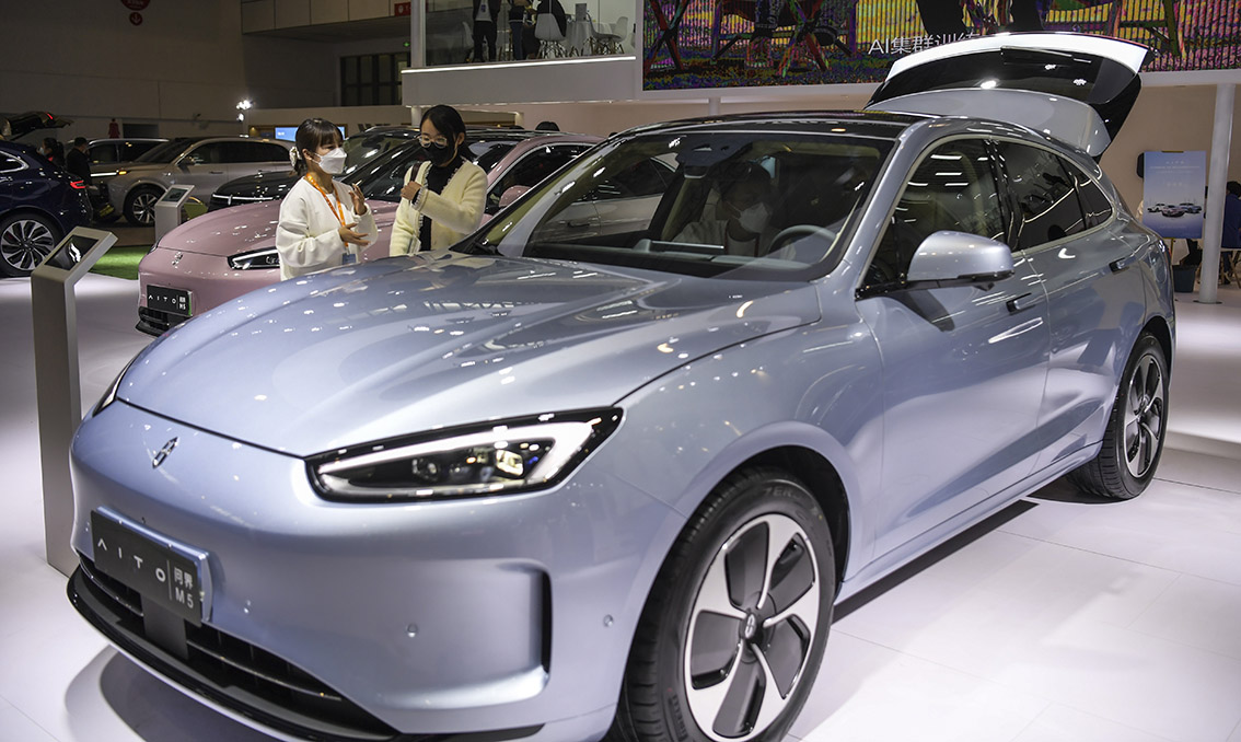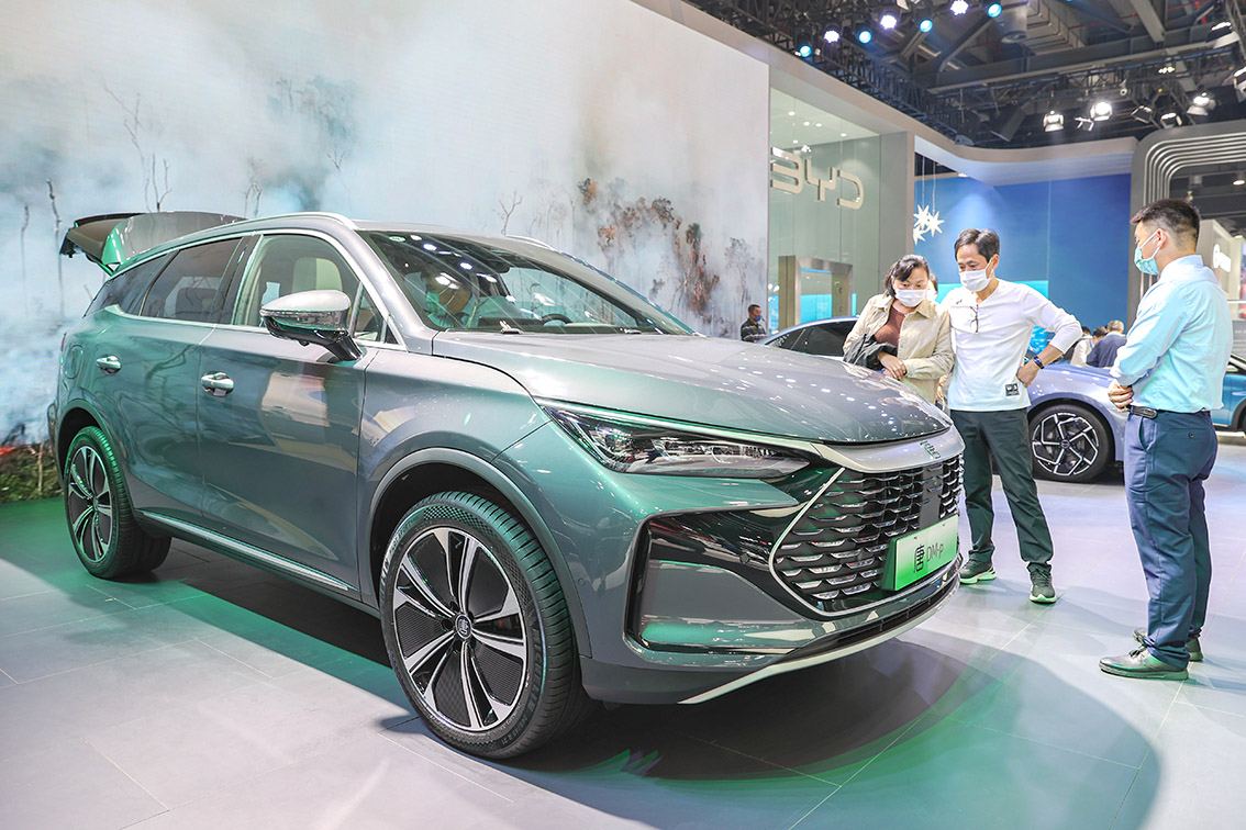 图为2022第十七届南昌国际汽车展现场,几位市民在观看和体验一辆新能源汽车。(图片来源:中新网)