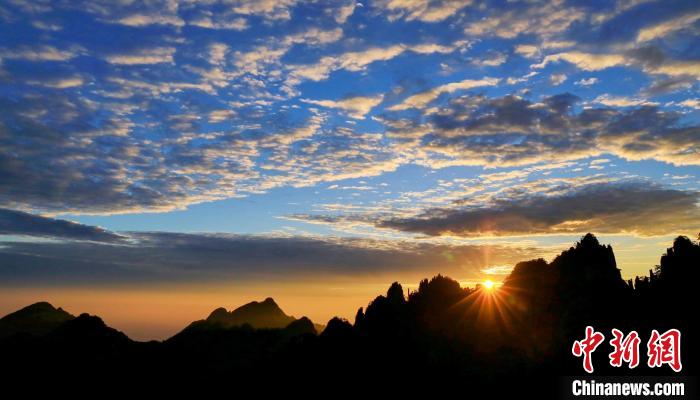 11月3日,安徽黄山出现壮阔云海景观。图为霞光之下的黄山群峰“剪影”景象。
