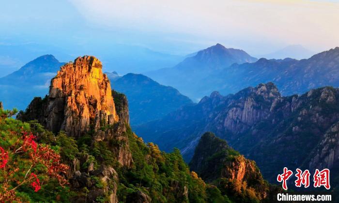 11月3日,安徽黄山出现壮阔云海景观。霞光映照山峰金辉熠熠。