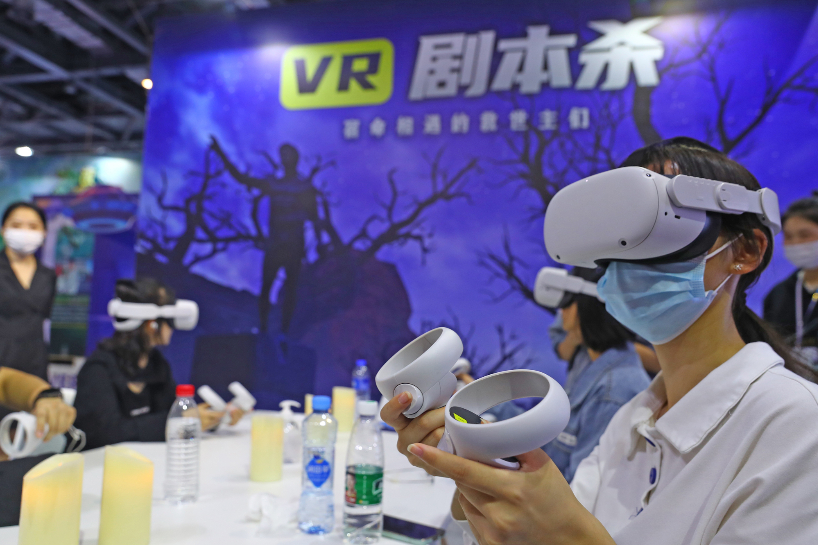 当日,在江西南昌,一名女子戴着VR眼镜与同伴体验“VR剧本杀”。(图片来源:中新社)