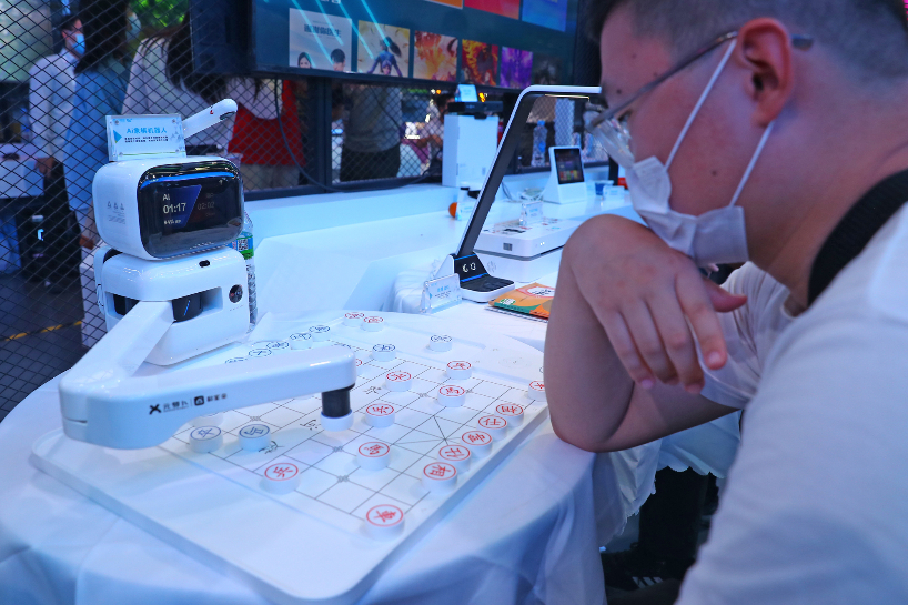 一位男子正在与AI象棋机器人对弈。(图片来源:中新社)