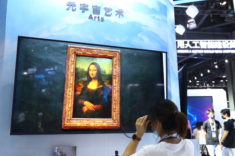 一名女子正在观看“元宇宙艺术”里的艺术作品。(图片来源:中新社)