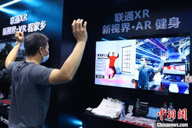 一位男子跟着画面中的影像作出相应动作,体验AR健身的独特魅力。(图片来源:中新网)