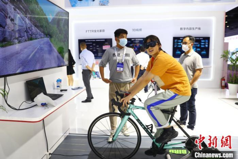 一名女子戴着VR眼镜正在体验骑行公路自行车。(图片来源:中新网)