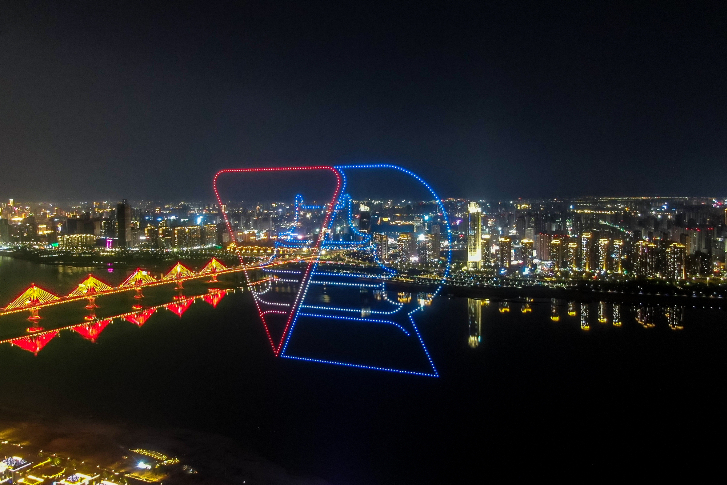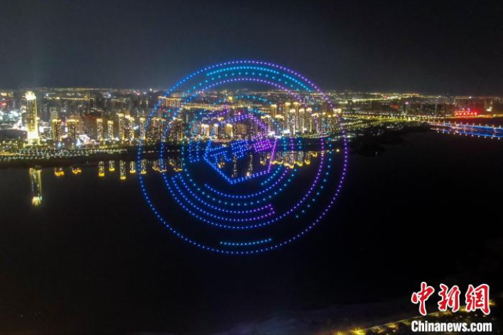 11日晚,无人机组成编队,用科技与光影的魅力,迎接2022世界VR产业大会。图为无人机在夜空中呈现出世界VR产业大会标志图案。(图片来源:中新社)