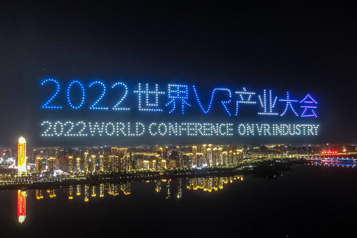 无人机在夜空中呈现出“2022世界VR产业大会”字样。(图片来源:中新社)