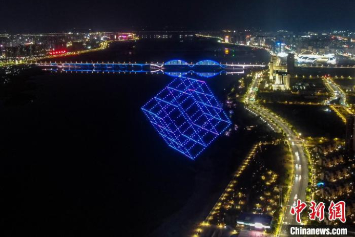 800架无人机组成魔方形状图案。本次无人机表演为2022世界VR产业大会主题活动之一,由空中未来科技集团策划实施,并围绕VR大会元素设计了上述图案造型,展现了本次大会利用先进信息技术,突破时空限制的新气象。(图片来源:中新网)