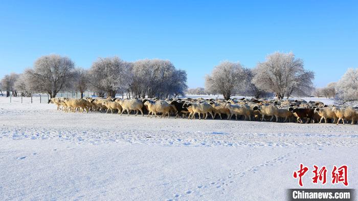 11月7日,“冬姑娘”如约而至,位于内蒙古大兴安岭腹地的边境小城额尔古纳市出现美丽的雾凇景观。羊群在雪地上留下一串串可爱的脚印。(图片来源:中新网)