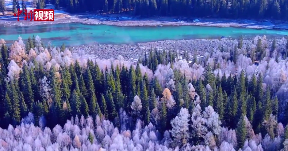 一场大雪后,新疆北部喀纳斯景区的原始森林被皑皑白雪覆盖,放眼望去,漫山遍野银装素裹,晶莹的霜花挂满树枝。(图片来源:中新视频)