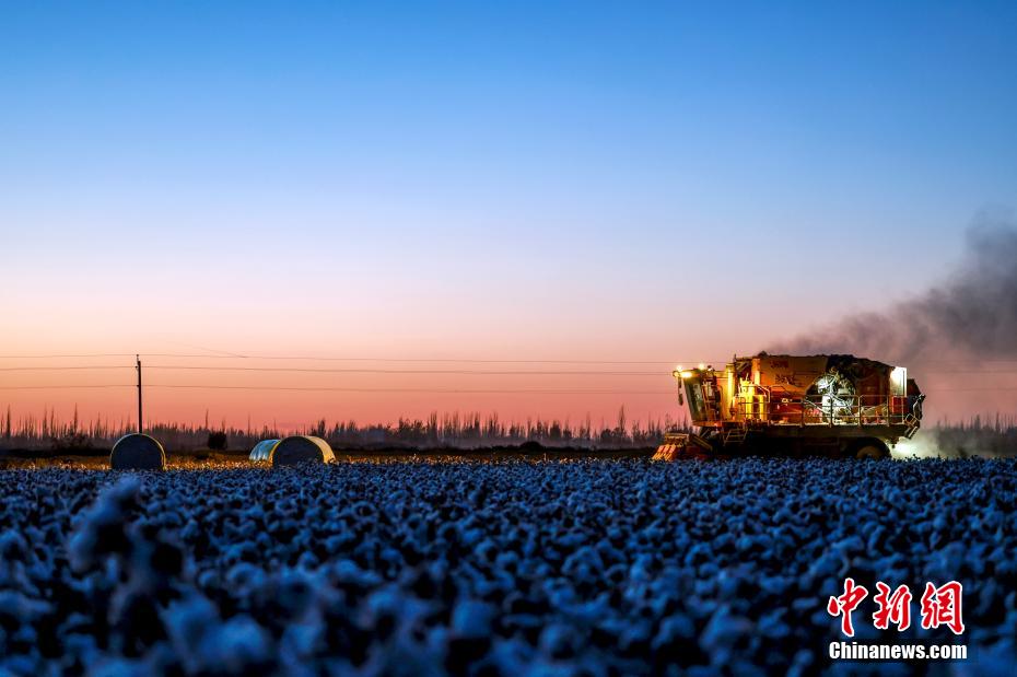 夜幕降临,采棉机仍在棉田中忙碌着。(图片来源:中新网)