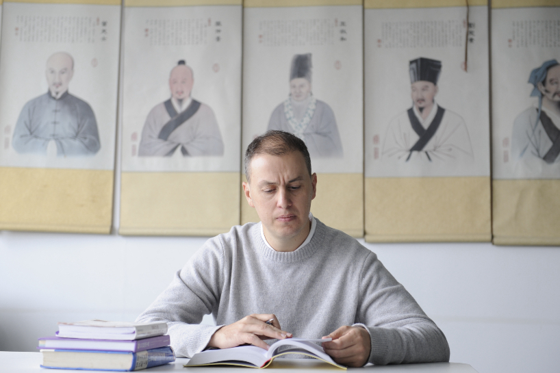 来自法国的菲利普·古斯特定居西安已有十余年,目前是当地一家皮肤中医药博物馆的副馆长。在西安的求学之旅中,菲利普·古斯特不仅学习到了中医知识,还收获了甜蜜的爱情。图为菲利普·古斯特学习中医知识。(图片来源:中新社)