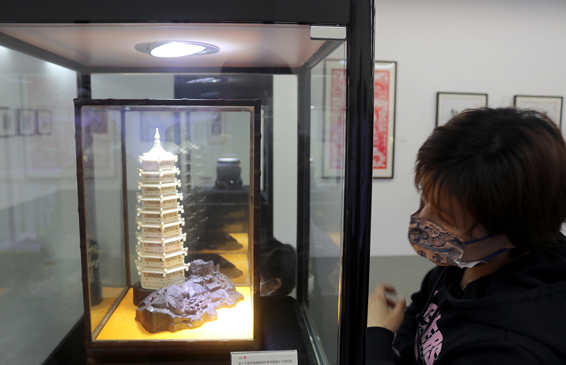 本次共展出包括织绣、雕塑、核雕、刺绣等在内的10个大类54个品种的212件(套)作品。
