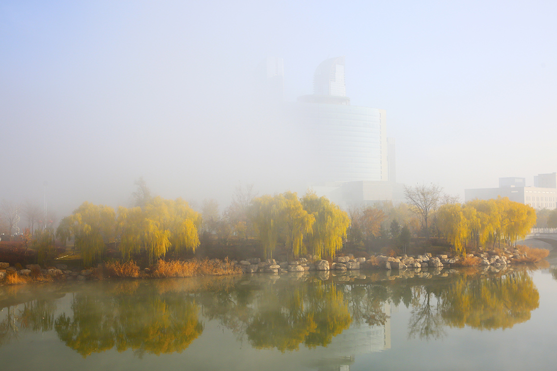 2022年11月12日,一场降雨过后,初冬的宁夏银川市迎来大雾天气,整个城市被大雾笼罩美若仙境。