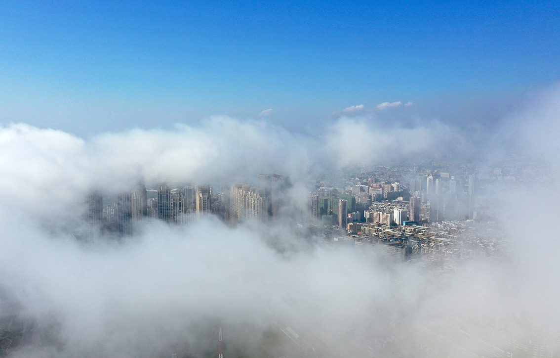 11月13日,福建省泉州市上空出现短时浓雾,城区的建筑物在其中若隐若现,宛如仙境。(图片来源:新华社)