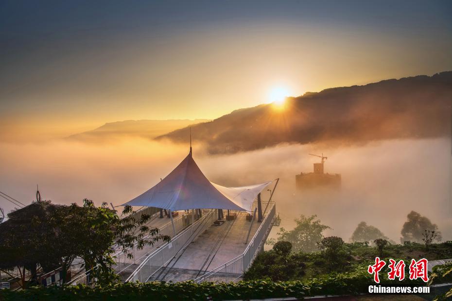 近日,平流雾笼罩重庆涪陵红酒小镇,宛若仙境。从高处眺望,只见雾气从江面弥漫开来,江岸的各种建筑和设施被雾气环绕,时隐时现,好似披上了一层淡淡的薄纱,美轮美奂。(图片来源:中新网)