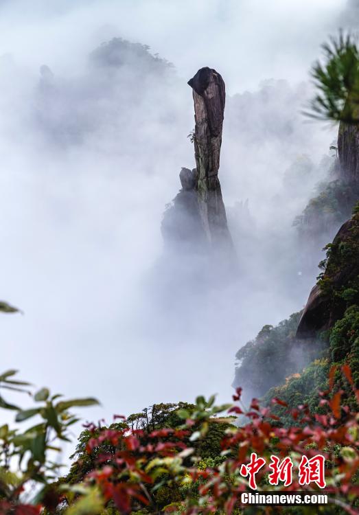 秋末冬初,世界自然遗产地江西三清山,标志性景观巨蟒出山在云雾中若隐若现。(图片来源:中新网)