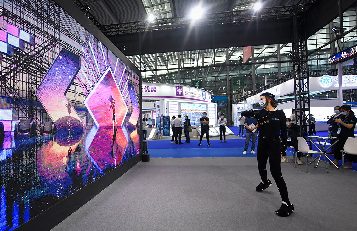 11月15日,在第二十四届中国国际高新技术成果交易会上,一家科技公司的工作人员展示光学动作捕捉技术。