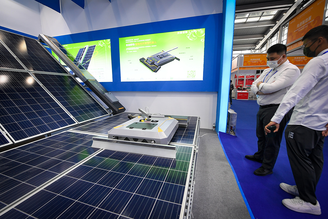 11月15日,在第二十四届中国国际高新技术成果交易会上,参观者了解一款智能光伏清洁机器人。