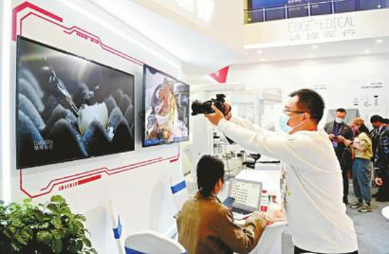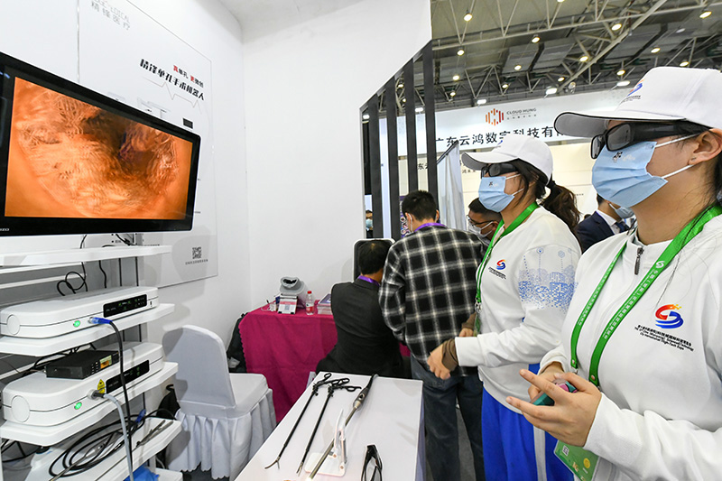 11月16日,在第十届中国(绵阳)科技城国际科技博览会上,志愿者佩戴特殊眼镜观看3D电子内窥镜屏幕。