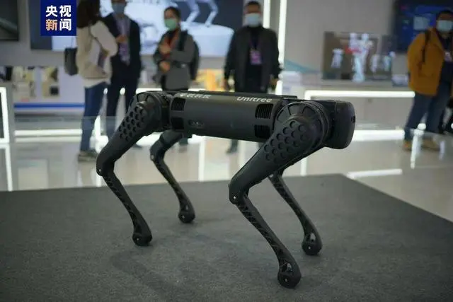 一款四足机器人在现场灵活跑动,引来众人围观。(图片来源:央视新闻)