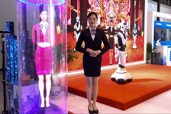工作人员与以自身为原型打造的AI虚拟人同台亮相。(图片来源:中新社)