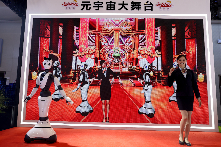 元宇宙大舞台上工作人员和机器人、AI虚拟人物共舞。(图片来源:中新社)