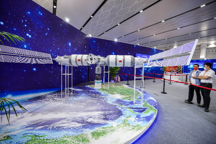完成T字构型的中国空间站组合模型亮相科普展。(图片来源:中新社)