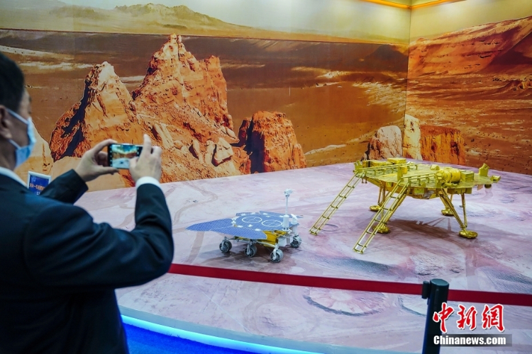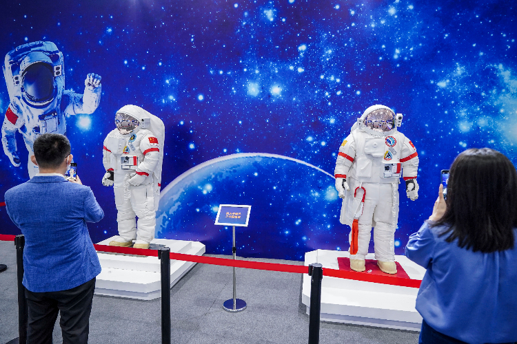 航天员舱外工作服模型吸引参观者。(图片来源:中新社)