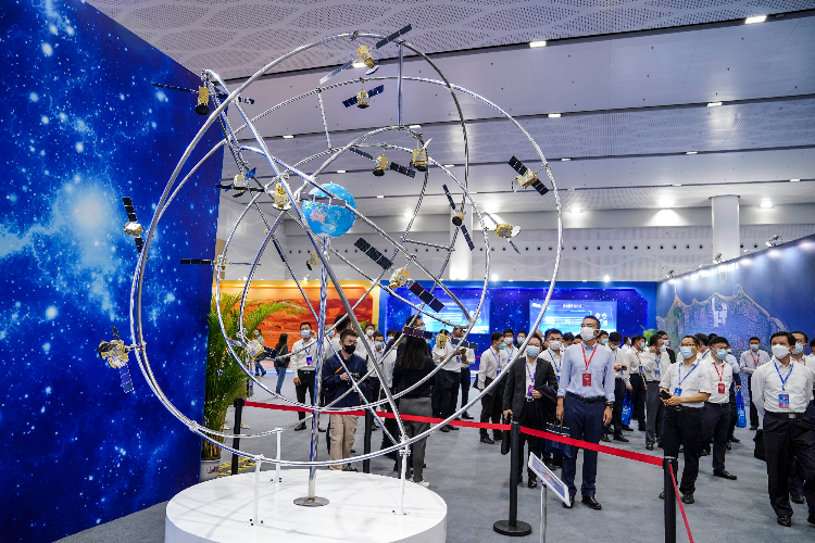 北斗导航全球组网模型亮相科普展现场。(图片来源:中新社)