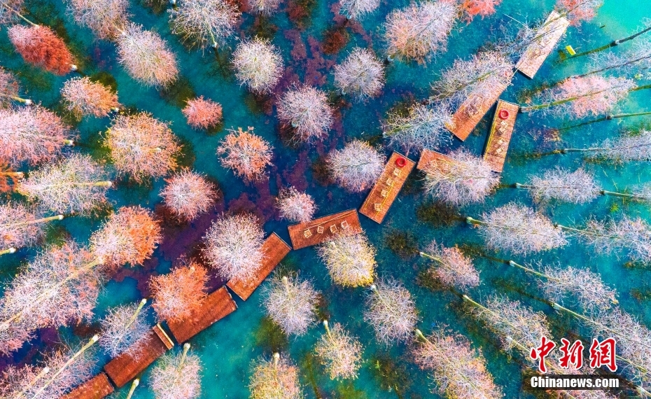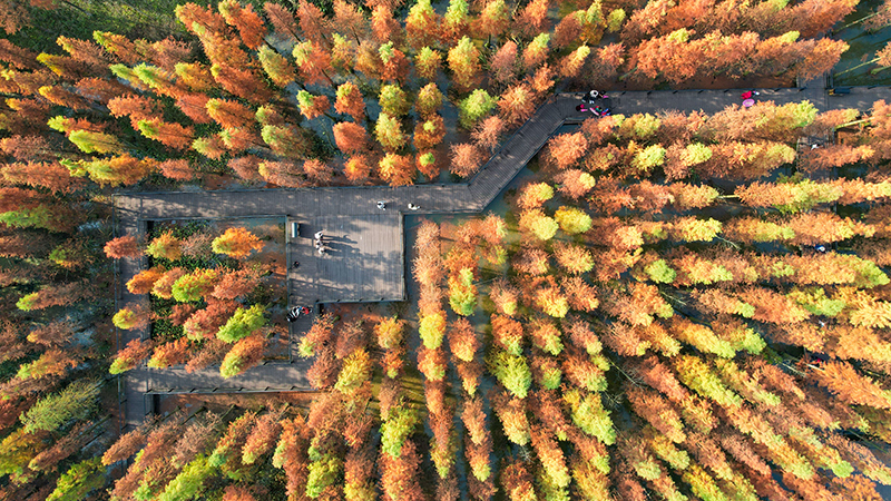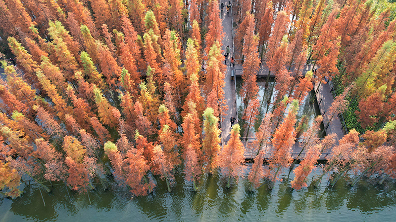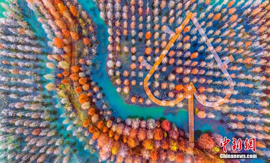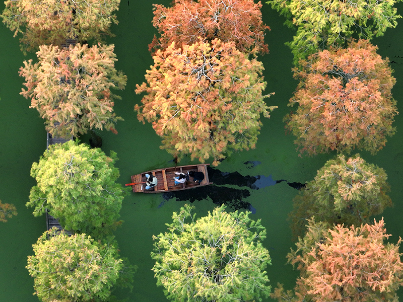 位于江苏省扬州市江都区邵伯镇的渌洋湖湿地公园内的“水上森林”层林尽染。图为11月9日,游客在渌洋湖湿地公园的水上森林乘船游览(无人机照片)。