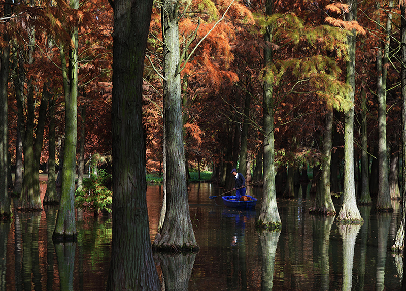 11月25日,工作人员在清理水面落叶。近日,上海青西郊野公园“水上森林”的水杉、池杉、落羽杉等枝头尽染,风景如画。