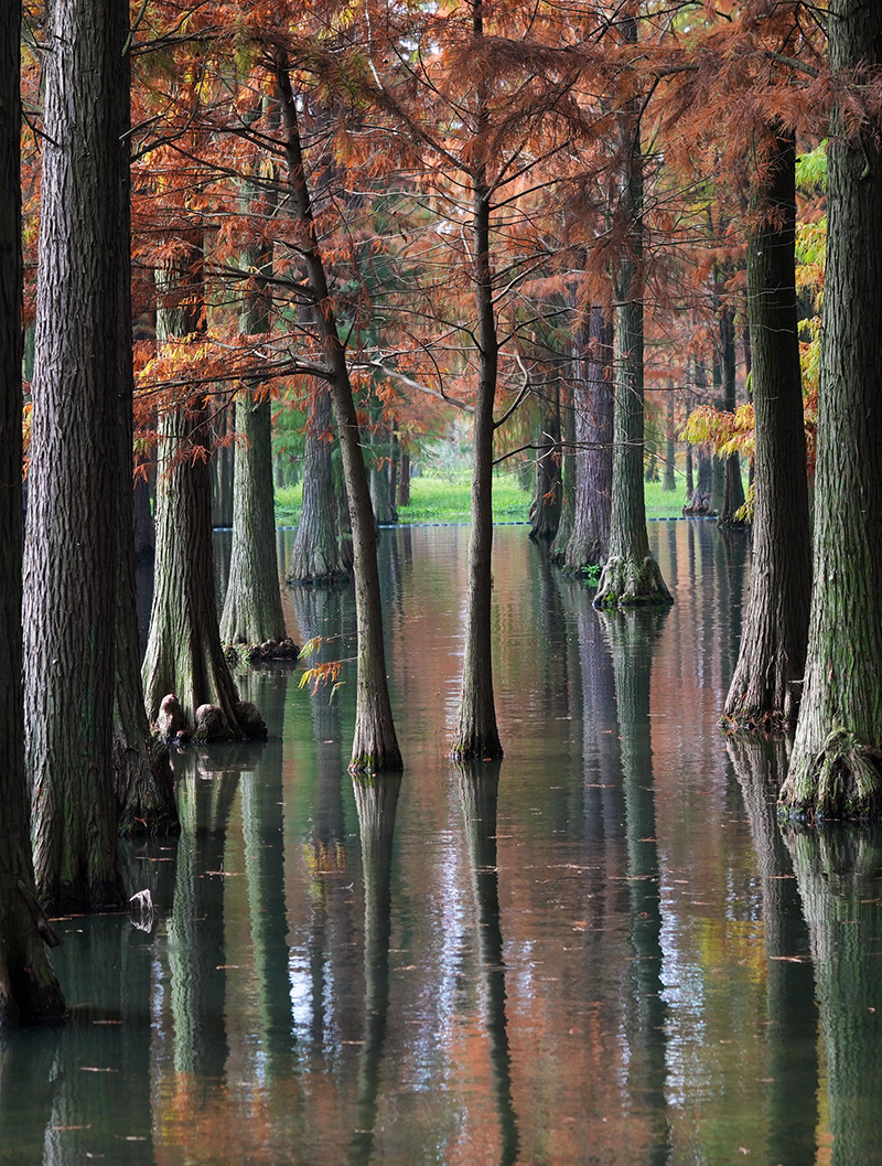 11月25日,江苏省宿迁市泗洪县洪泽湖湿地景区临淮段水杉林色彩斑斓,与碧绿的湖水相映成趣,如梦似幻。(图片来源:中新网)