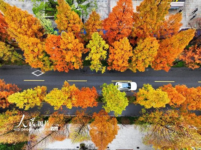 11月22日,江苏省扬州市长春路上的水杉大道的水杉树叶变红。(图片来源:人民图片网)