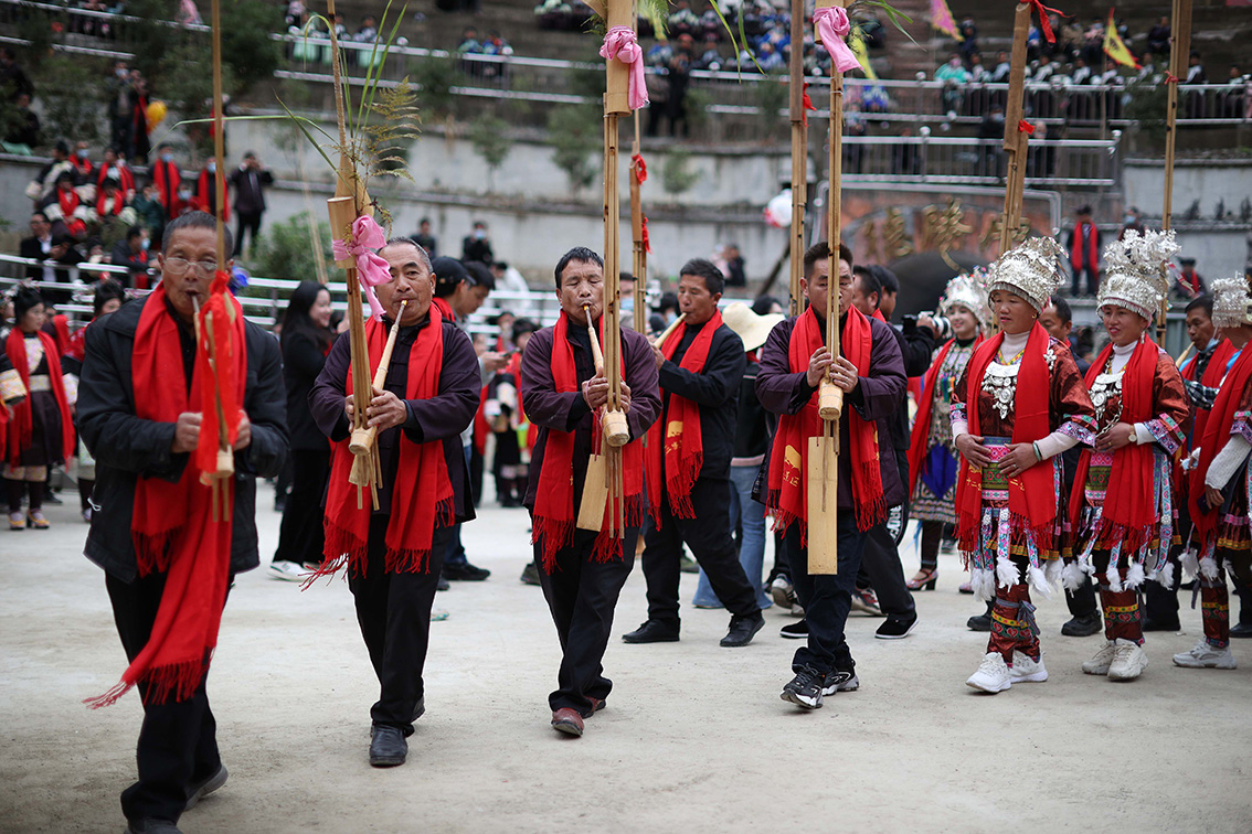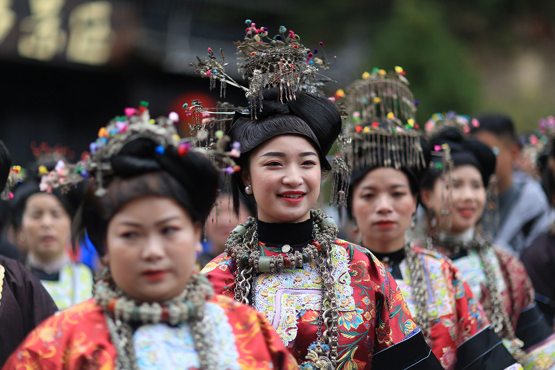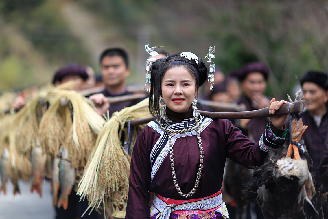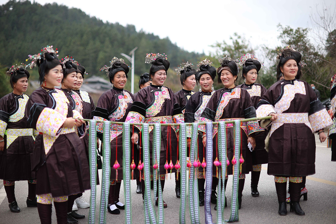 11月24日,在贵州省黔东南苗族侗族自治州榕江县乐里镇七十二寨,参加侗年活动的侗族同胞以传统礼仪迎接宾客。(图片来源:本文图片除标注外均自新华社)