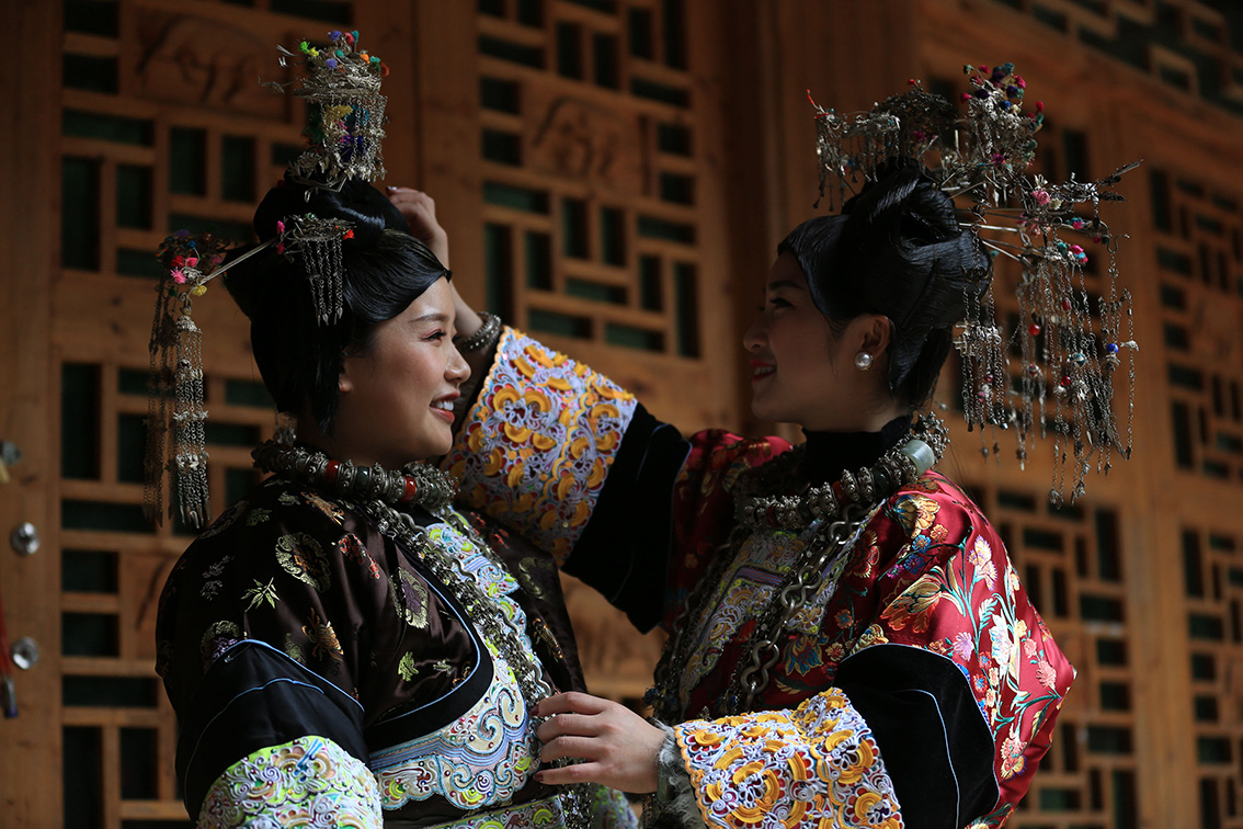 11月24日,在贵州省黔东南苗族侗族自治州榕江县乐里镇,侗族群众在整理盛装。(图片来源:中新社)