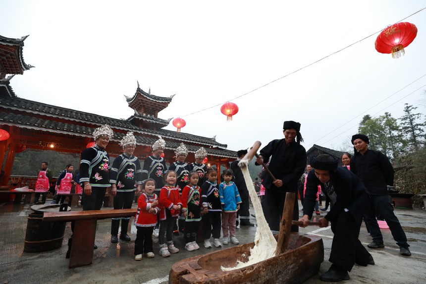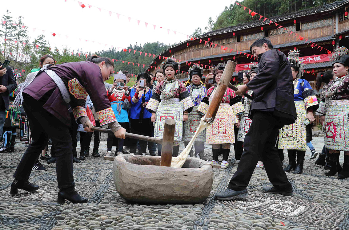 11月24日,在贵州省剑河县磻溪镇化敖村,侗族群众打糍粑欢度侗年。(图片来源:人民网)