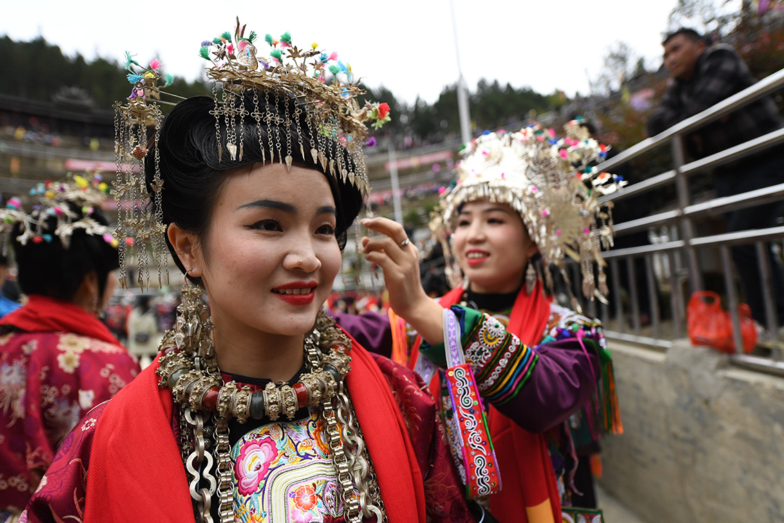 11月24日,参加侗年活动的侗族同胞在整理头饰。