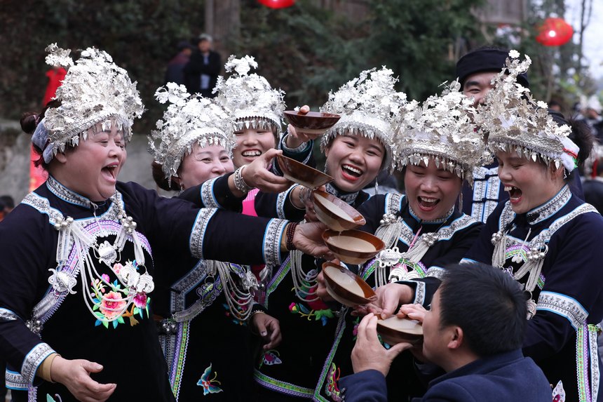11月24日,在贵州省剑河县磻溪镇化敖村,侗族群众吃团圆饭,给亲朋好友敬酒。(图片来源:人民网)